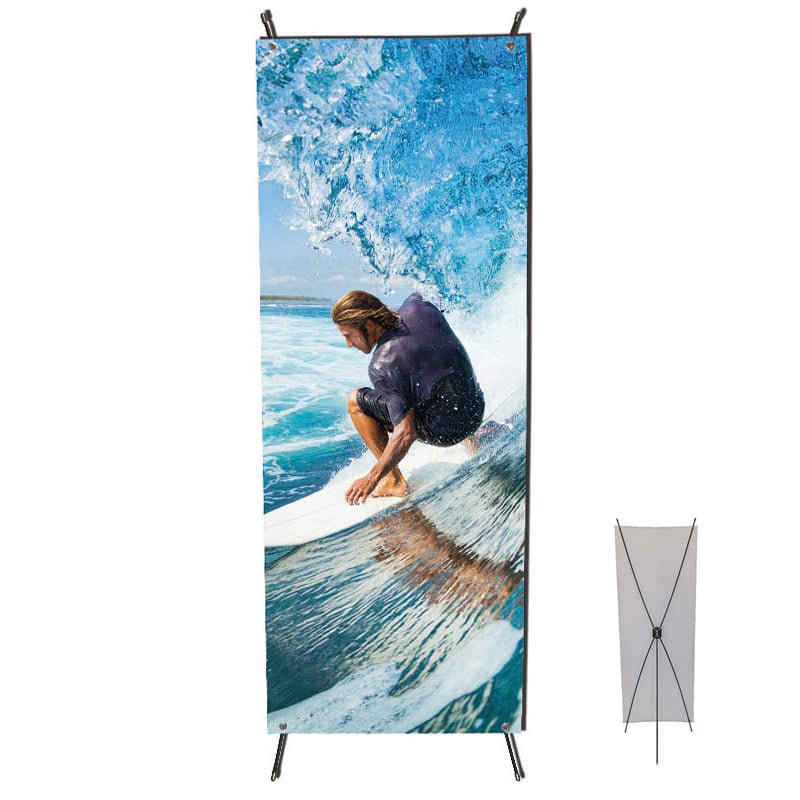 Le Kakémono X totem publicitaire ressemble à un kakémono autoportant vertical composé d’une structure rigide en X. Et d’une bâche comportant 4 œillets aux 4 coins. En fixant la bâche aux 4 coins de la structure, vous stabiliserez la signalétique publicitaire. Et à la fois vous déploierez le visuel imprimé et diffuserez votre message auprès de votre public. Tel un roll-up, un stand, un comptoir ou mobilier d'accueil. Il fait partie de la grande famille des supports de communication de la PLV expo stand.