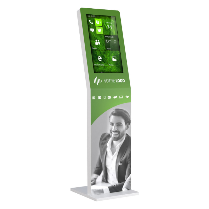La borne interactive verticale est personnalisable, vous pourrez ajouter votre logo et plein d'autres informations nous présenter les visuels dont vous avez besoins. Grâce à son utilisation intuitive, elle vous offre une facilité d'utilisation. Lors de vos évènements ou de vos salons, n'hésitez plus ! Ce support est utile afin de communiquer de manière rapide et efficace. C'est pour vous l'opportunité de captiver l'attention de vos clients pour avoir un impact significatif sur leur comportement d'achat.