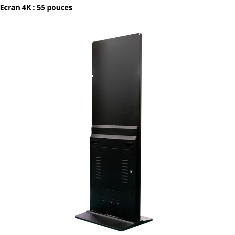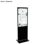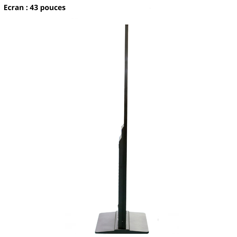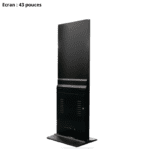 Totem vertical en métal et verre ÉCRAN 43’’ (108 cm) Résolution 1080x1920p Angle de vue 89° Dimensions image 940.896 x 529.254mm Rétro-éclairage WLED