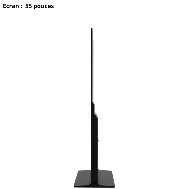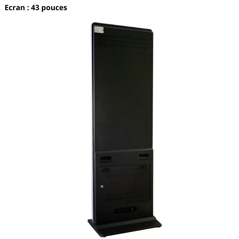 Totem vertical en métal et verre ÉCRAN 43’’ (108 cm) 16/9 Résolution 1080x1920p Angle de vue 89° Luminosité 400cd/m2 Contraste 1200:1 Dimensions image 940.896 x 529.254mm Rétro-éclairage WLED