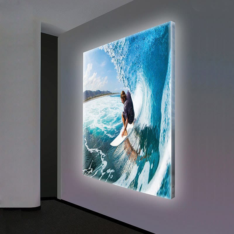 Le cadre mural rétro éclairé moderne utilisé pour l'éclairage de fond des visuels sur les cadres textiles offre une utilisation économique longue durée. Grâce aux lumières LED, le motif imprimé sur les visuels en tissu est uniformément éclairé par l'arrière. Les bords du cadre rétroéclairé LED ont la particularité d'être très discrets. Ils sont donc à peine visibles de face.