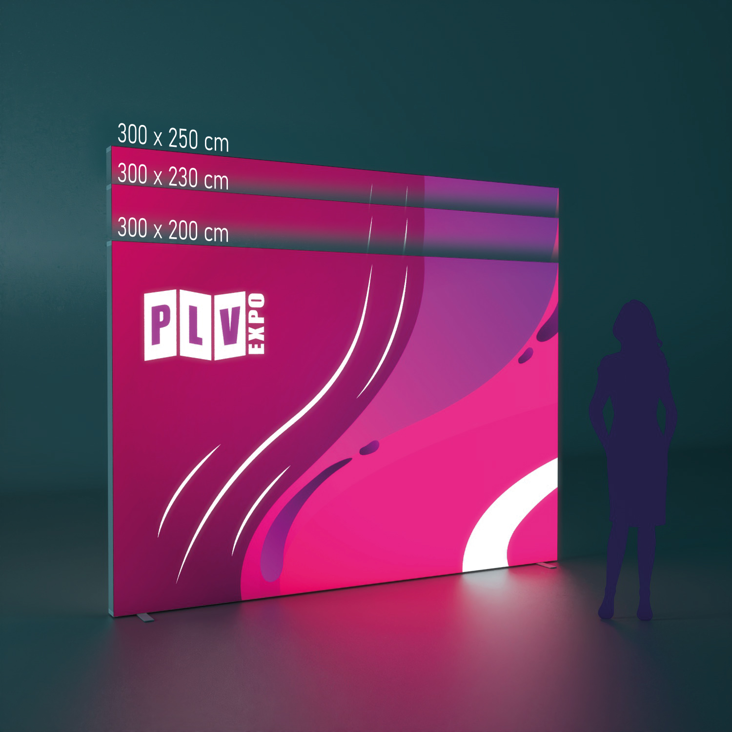 Le cadre rétro-éclairé standard est le choix idéal pour vos stands, événements, et salons. Ce mur d'images lumineux est conçu pour capter l'attention à distance grâce à son éclairage intégré. Spécialement conçu pour offrir un éclairage de fond uniforme sur des visuels textiles diffusants, les LED garantissent un effet visuel spectaculaire à la fois au recto et au verso du cadre.