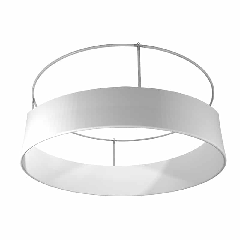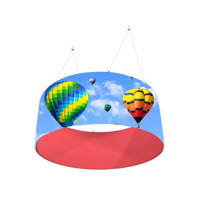 Enseigne suspendue circulaire disponible en différents formats. Installation simple et en toute sécurité pour un stand d'exposition et toute autre PLV d'intérieur.